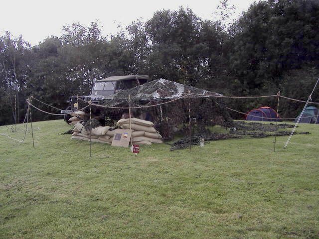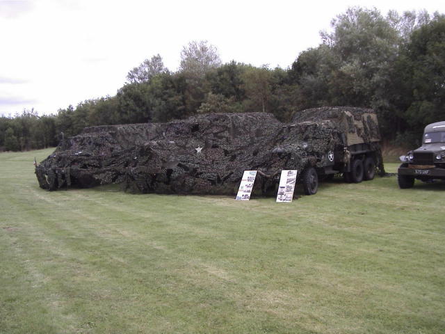 A Charity Open Day was organised at the Arvin Meritor Engine Test site at Warton, Lancashire, and where we were invited to set up our vehicles as part of the display. Large amounts of cammo netting had been given to Bob so it was decided to drape it over Dave's Reo, Richard's Mack and Bob's GMC to show how it would be used in the field. Unfortunately it worked too well and nobody could see the vehicles. Other netting was spread between three US tents, one of which was used for a display of different military uniforms.