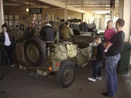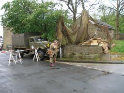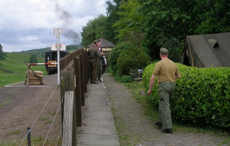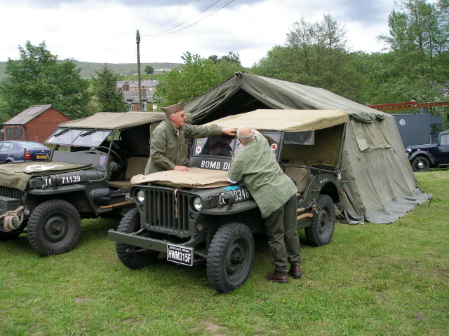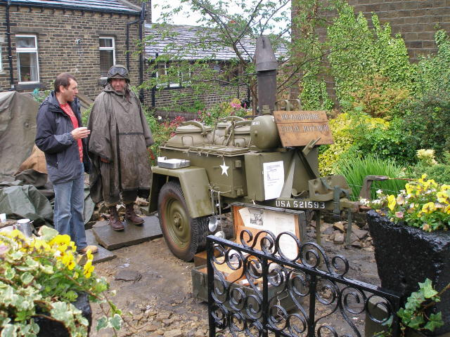 Well Neil and the ELR crew managed to pull it off again with a bigger and better event than last year. This year the main military vehicle camp was based at Irwell Vale and wasn't it a belter of a site. The village is easily reached via the ELR train to its own station. The village Association had been working since June last year to get the village green turned from a quagmire into a well turned out green ready to accept the "invasion force" that was to be the Allied mustering point. It was prepared by Tony Lee and friends to look like a meeting point at a French crossroads. One of the dioramas was of Henry Litowski's field hospital and Jeep marked with a red cross. I'm not sure a watercooled Vickers machine gun would have been mounted on such a vehicle, but I suppose if business is light, you can always create some patients of your own. A field was available at the entrance to The Burrs and one or two of our group made use of that facility. It is closer to Bury, the centre of the weekend's activities, so it does have a benefit. Irwell Vale entertained the troops with a barbeque on Saturday night that was well attended by the re-enactors who stayed there, and the locals. It started t look like rain so Dave and Barry sensibly put the roofs on their Jeeps. Unfortunately as the night went on, it turned colder (see the photo of our group mostly in greatcoats), but the bonfire that was lit soon after the barbeque was finished helped warm us up. The rain held off for most of the evening, but during the night it poured down.
