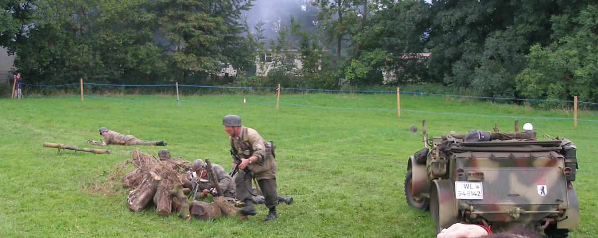 The weekend event at Penaemawr was organised by a local councillor, Vivienne Mooney. She visited Rawcliffe Hall looking for ideas last year and booked the North West Military Collectors on the spot. Apart from MVT members in the North West Collectors, there was only myself, Geoff Brogden and Tim & James Hardy turned up, not forgetting the MVT member of the Home Guard, David Wild. OK yes I did forget! The weather for the weekend was predicted to be bad but overall it was quite acceptable. The campsite was passable but was not solely for our use as it was a camp site for the general public as well. Friday night was spent with the NWMC under their dining shelter; Geoff is a member so I joined in. The wind came up on Saturday evening while we were out at the organised dance and blew a number of tents down, and caused some damage to others. The NWMC battles on Saturday and Sunday were held on the beach, and raced against the incoming tide. Gary's Jeep, armed with a gas powered 50 cal, was close to being stranded in the water during one of the battles. Apart from the battles there was not much else to do; the village seemed closed apart from one or two shops supporting the event with staff dressed in 40s period clothes. I was surprised there was no real support from the MVT. I expected the North Wales MVT to be there in force but perhaps they had something else to do. I know Vivienne is trying to grow the event so I would suggest she talk to the local MVT and get their support. Other ideas to keep the visitors to the event occupied may then be forthcoming.