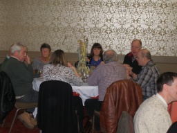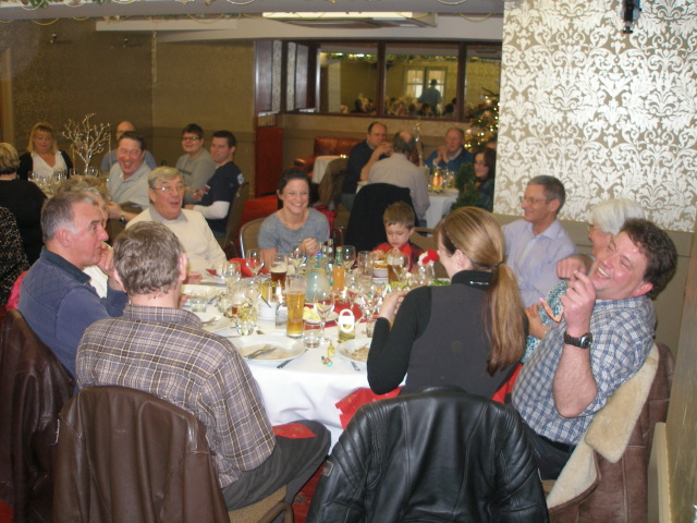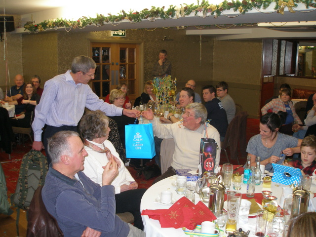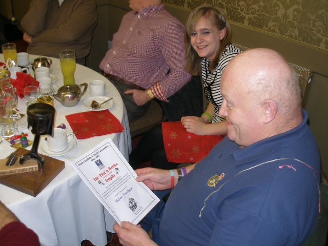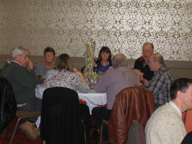 Liz Russell organised a New Year meal at the Longlands Hotel in Carnforth for the first weekend of the New Year. As usual this was a well attended event with a record 58 people taking part. Runs were arranged from both the north and south of the area. The run from the south taking in Dunsop Bridge, and the Trough of Bowland. Everyone agreed the food was excellent and the company even better. Thanks to Dave Salisbury for some of the photos, and the others were provided by me. An extra celebration was Dave Fellowes' Birthday when Norman eventually got his revenge for similar embarrassment at the War & Peace show. Another embarrassment may have been the award of the Piston Broke award for the most breakdowns of an MVT vehicle for the previous 12 months. Dave Forshaw won this prize, carefully crafted by our resident engineering sculptor, Jon. Dave will retain this award for 12 months so keep your vehicles in good order or this could be you next year!. You have been warned. If there are any photos from the northern contingent, I'll add them to the site if you let me have copies.