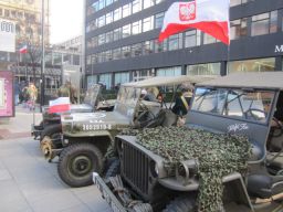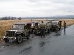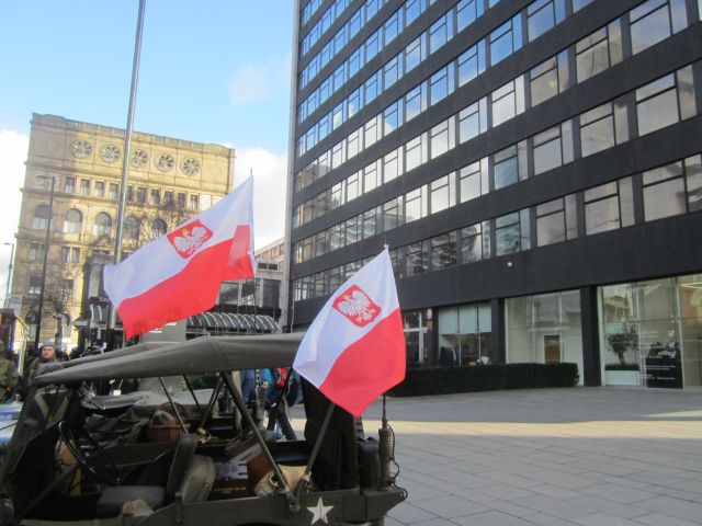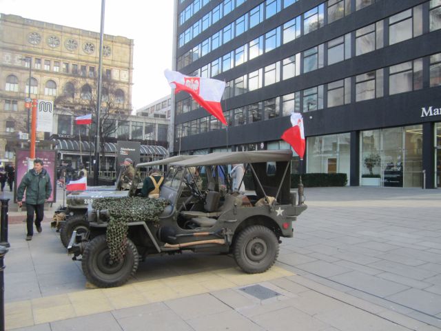 To support the 75th Anniversary commemorations, the Consul General of the Republic of Poland in Manchester had invited re-enactors and military vehicle owners to the event which was held in Manchester city centre. Keith and Celanie Ball, Dave Salisbury and Ian McCormack accepted the invitation and made their way along a bitterly cold A6 through such picturesque villages as Walkden and Little Hulton to the heart of the city. Undaunted by No Entry signs, buses, pedestrians and other such impedimenta, the Jeeps were soon parked up in front of the Consulate on Portland Street.