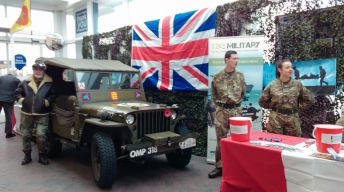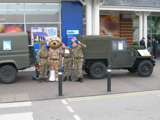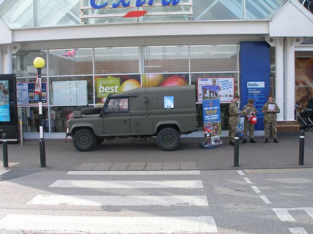 Across the country Tesco stores have been raising money for Help For Heroes. The Blackpool store was no different. They asked for help from our Area to provide a couple of vehicles to park around the entrance to the Store, and to form a backdrop to the Army Cadets who were doing the actual collection. On the Saturday, Ian Wray and Esther Crane turned up in their Jeep accompanied by Norman with his Lightweightt LandRover. Ian managd to manoeuver his Jeep into the actual entrance while Norman took up post outside. On the Sunday I turned up with my LandRover 110 and considered doing what Ian had done. A quick examination of the surrounding area put me off with bollards and other obstacles strategically placed to stop a vehicle like mine gaining access. So I parked outside the entrance to be joined later by Norman with his Lightweight.