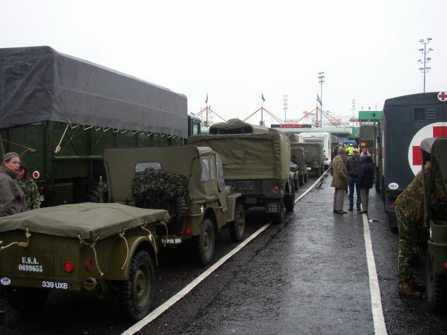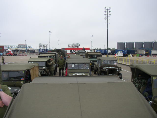 After spending a few riotous nights at Horndean, it was a case of load up the vehicles and head for Portsmouth. There the queues to load onto the ferry were enormous with military vehicles of all types joining in.