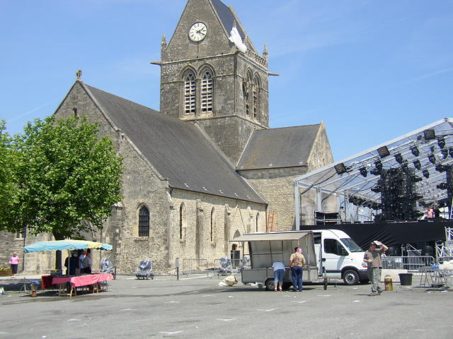 No trip to this part of France would be complete without visiting St Mere Eglise. In memory of the paratroop landings there, and the memory of the poor paratrooper who landed on the church tower only to be shot in his harness, a dummy now hangs from a parachute on the church tower.