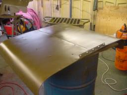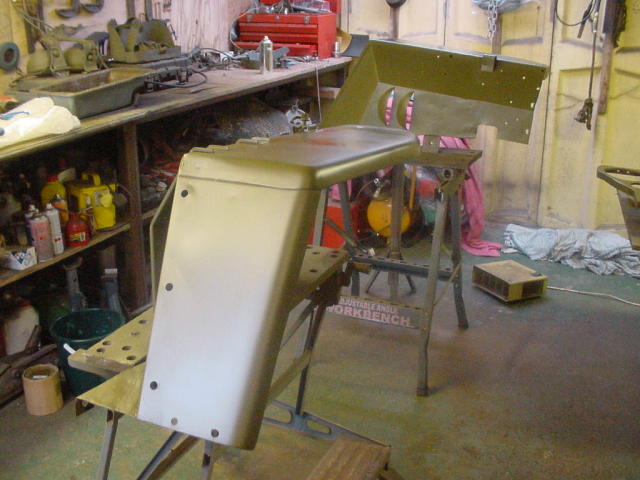 The chain has so much slack in it that it knocks against the housing, as can be seen. It therefore needs replacing, so one has been ordered and will be with Bob by Wednesday. In the meantime the wings, bonnet, radiator grille and other bolt on bits of bodywork have received their coats of paint. On close examination of the front wings, an "F" script is stamped into the metal. With a little care, this is still visible under the coats of paint.
